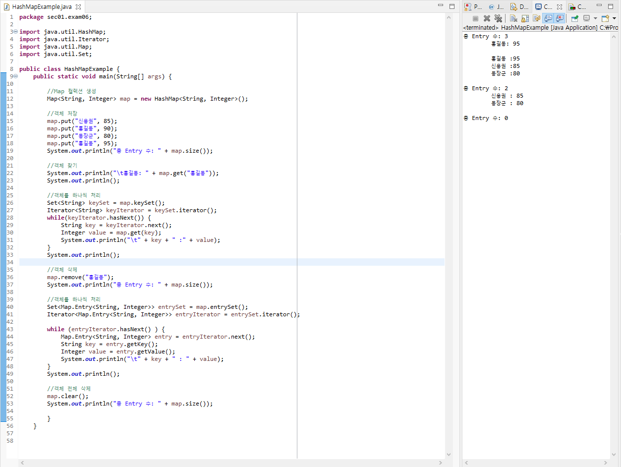 HashMap의 컬렉션 생성, 객체 저장, 객체 찾기, 객체를 하나씩 처리, 객체 삭제, 전체 객체 삭제의 사용법을 알 수 있는 예제