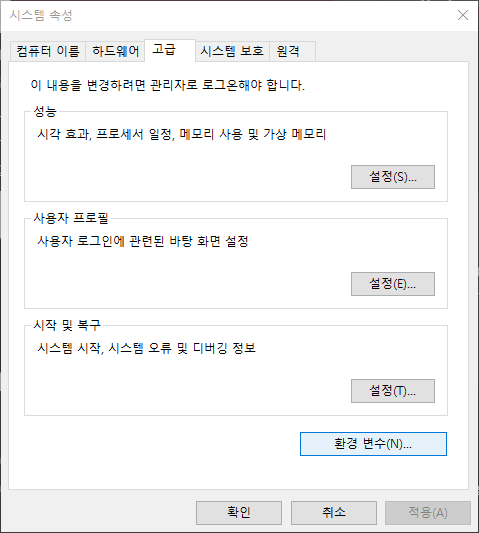 01. [고급] 탭 선택 -> [환경 변수] 클릭